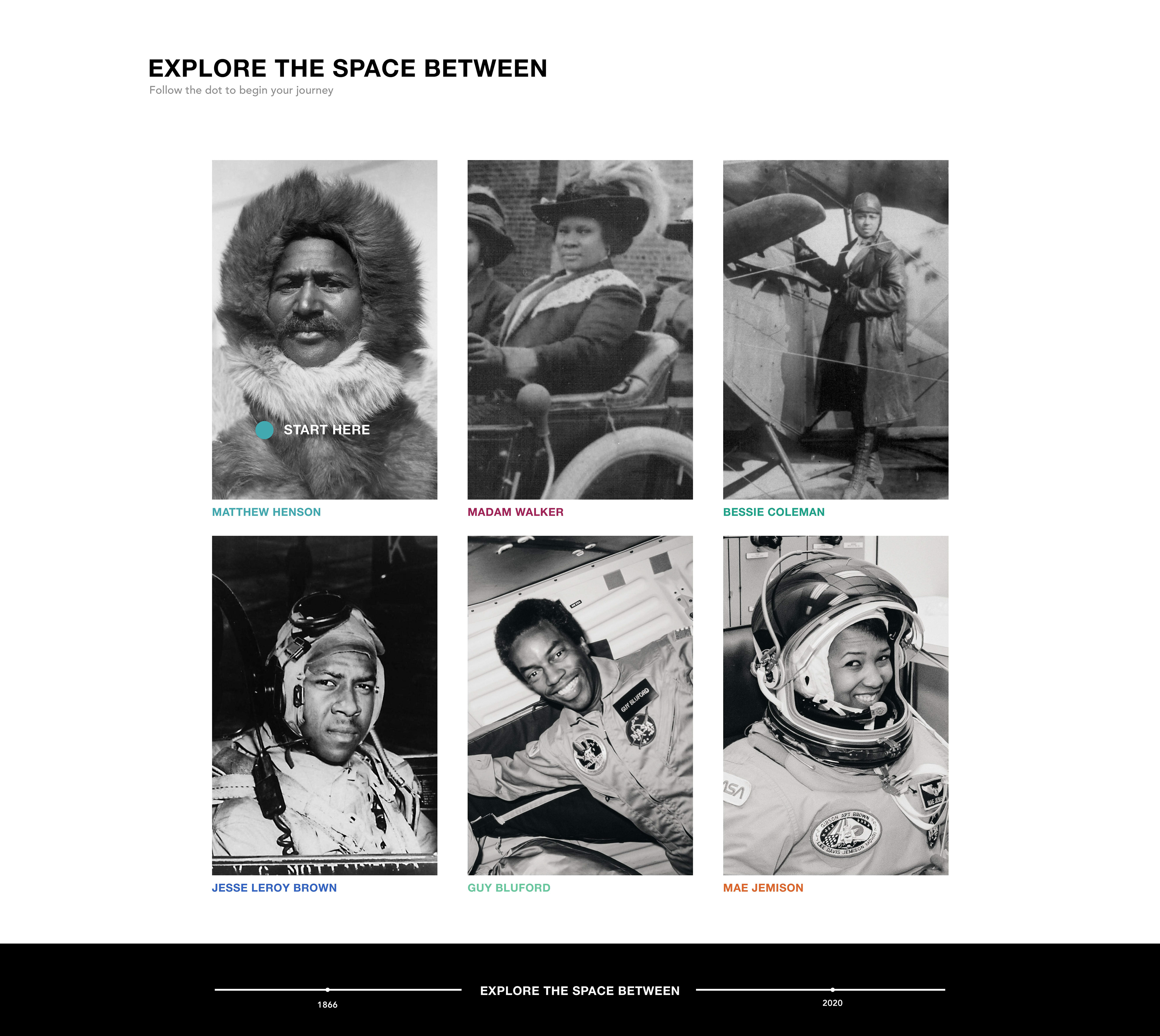 This designed web experience highlighted the grit and resilience in the individual stories of six black Americans. Each story captured my heart and Jessy Leroy Brown’s story brought me to tears. I feel it is significant to be aware of the fact that stories are not just words on paper or on a screen. Stories are how we remember life. To tell stories is to be awake and present. It is a significant thing to remember and cherish those who lived beautiful lives and did not let adversity stop their efforts. The lives of these individuals span the space between 1866 and 2022, as both the first African American man and woman launched into space are alive today. After walking through a timeline of each individual, viewers are prompted to continue exploring. My goal was that their lives would be remembered and that viewers would feel a stirring to become more informed, digging deeper into their stories that are both heartbreaking and overwhelmingly triumphal. Let us celebrate and value those who are undervalued and opposed. Let us love one another.